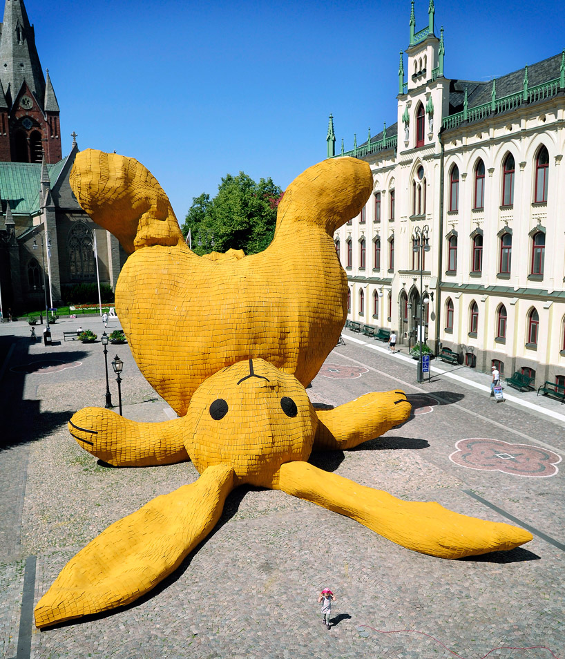 這是荷蘭的藝術家florentijn hofman最近創作了一個巨型公共藝術作品“stor gul kanin”(大黃兔),這件雕塑作品是專門為今年夏天在瑞典中部城市Örebro舉辦的openart雙年展而創作。